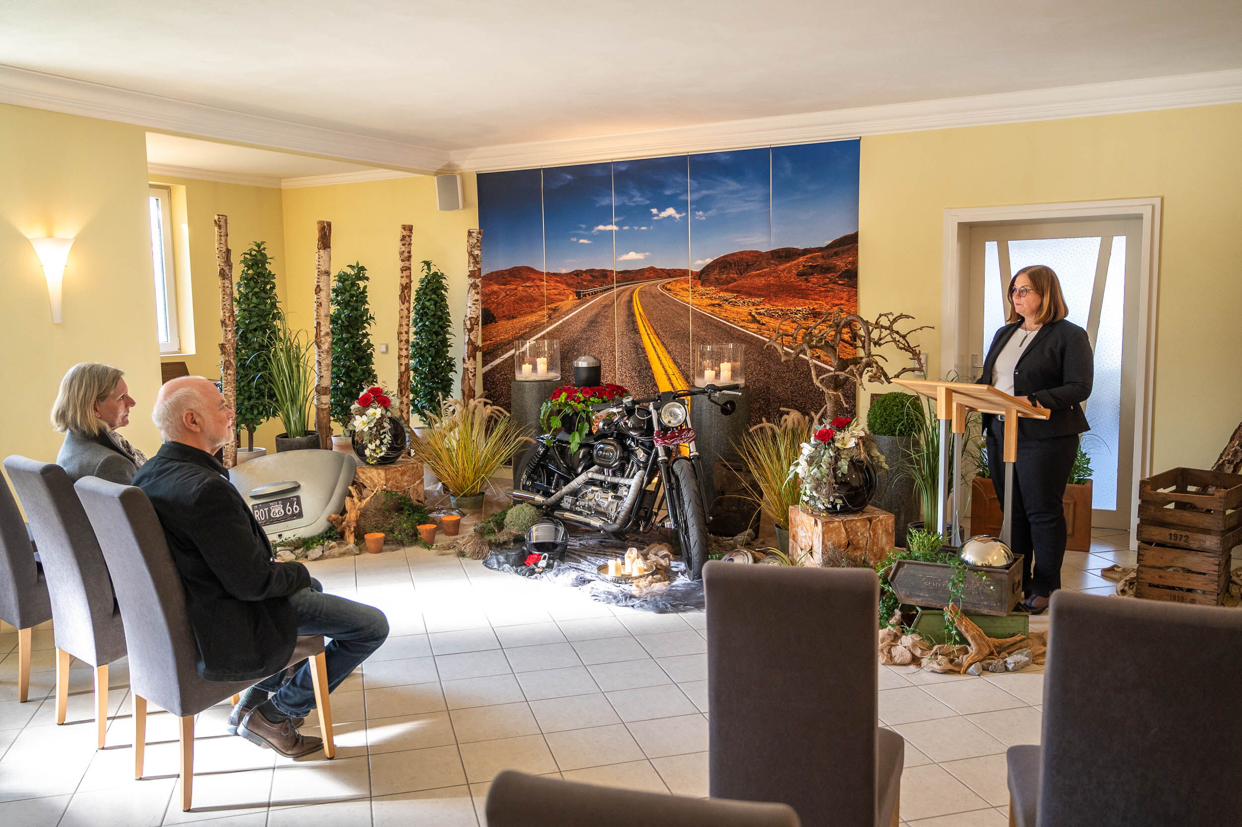 Die Trauerfeier richten wir Deko-Elementen, Blumen und Farben so für Sie aus, dass die Abschiednahme die Persönlichkeit des Verstorbenen wiederspiegelt: Möglicherweise war Ihr verstorbener Angehöriger in seiner Freizeit begeisterter Motorradfahrer, glühender Pferdeliebhaber oder passionierter Gärtner? Vielleicht war er eher ein kreativer Kopf, der malte oder jedes Kreuzworträtzel löste? Womöglich war der Verstorbene auch Mitglied in einem Verein oder gar in der hiesigen Gemeinde sozial engagiert?